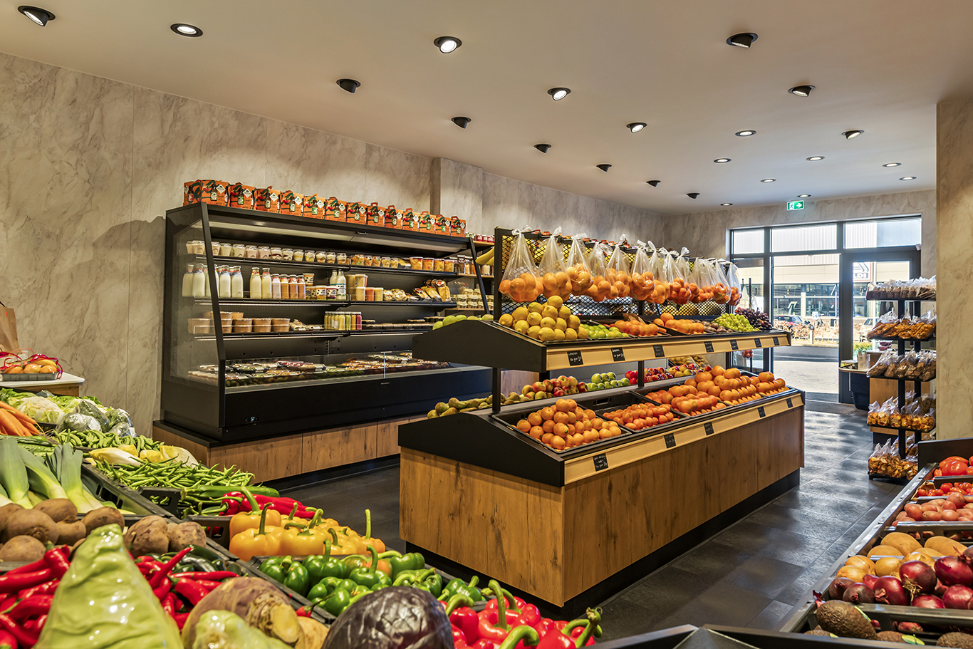 Aan de Van Vollenhovenstraat in zijn geliefde Rotterdam, daagde Marco Vreugdenhil ons uit om zijn tweede winkel te realiseren. Om van een klassiek herenhuis een AFG-winkel te maken zijn vaak forse ingrepen nodig. Zo moest er in dit geval, onder meer, een deel van de achtergevel worden verwijderd om de koelwand met glasdeuren te kunnen installeren. Ook het historische plafond en de historische vloer mochten niet aangeroerd worden. Voor de verlichting, cruciaal in een vers-winkel, bedachten we derhalve een bijzondere staalconstructie, van wand tot wand. Hieraan werden de lichtrails met armaturen bevestigd. Een ongebruikelijke constructie maar wel één met een bijzonder effect.