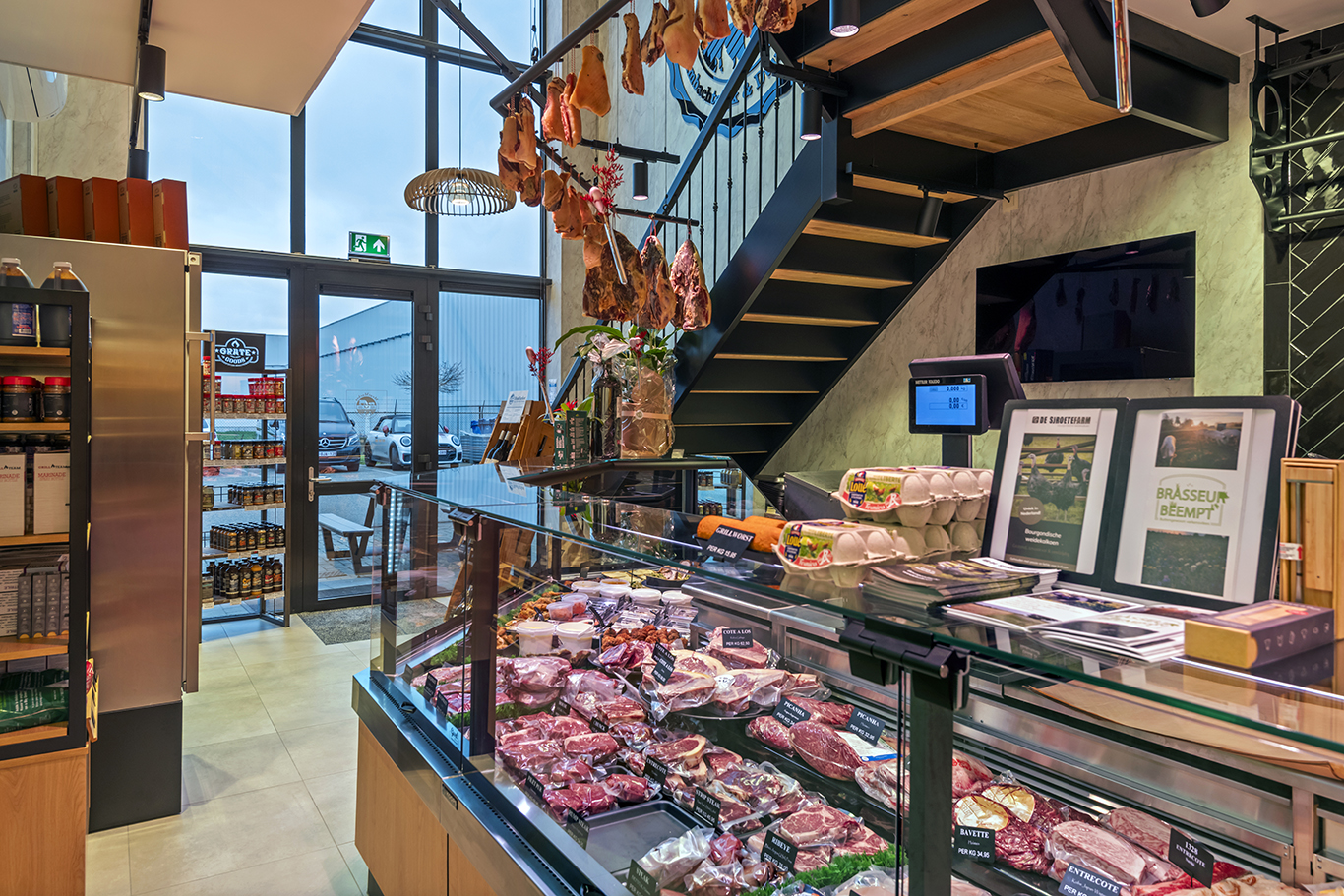 In samenwerking met Koops Koeltechniek realiseerden wij een bijzondere verbouwing voor de familie Peeters in België. Deze horecaslager werkt al jaren vanuit een bedrijfsverzamelgebouw op een industrieterrein. In het pand was eerder een kleine winkel gevestigd met een bescheiden toonbank, maar het werd tijd voor uitbreiding en professionalisering.